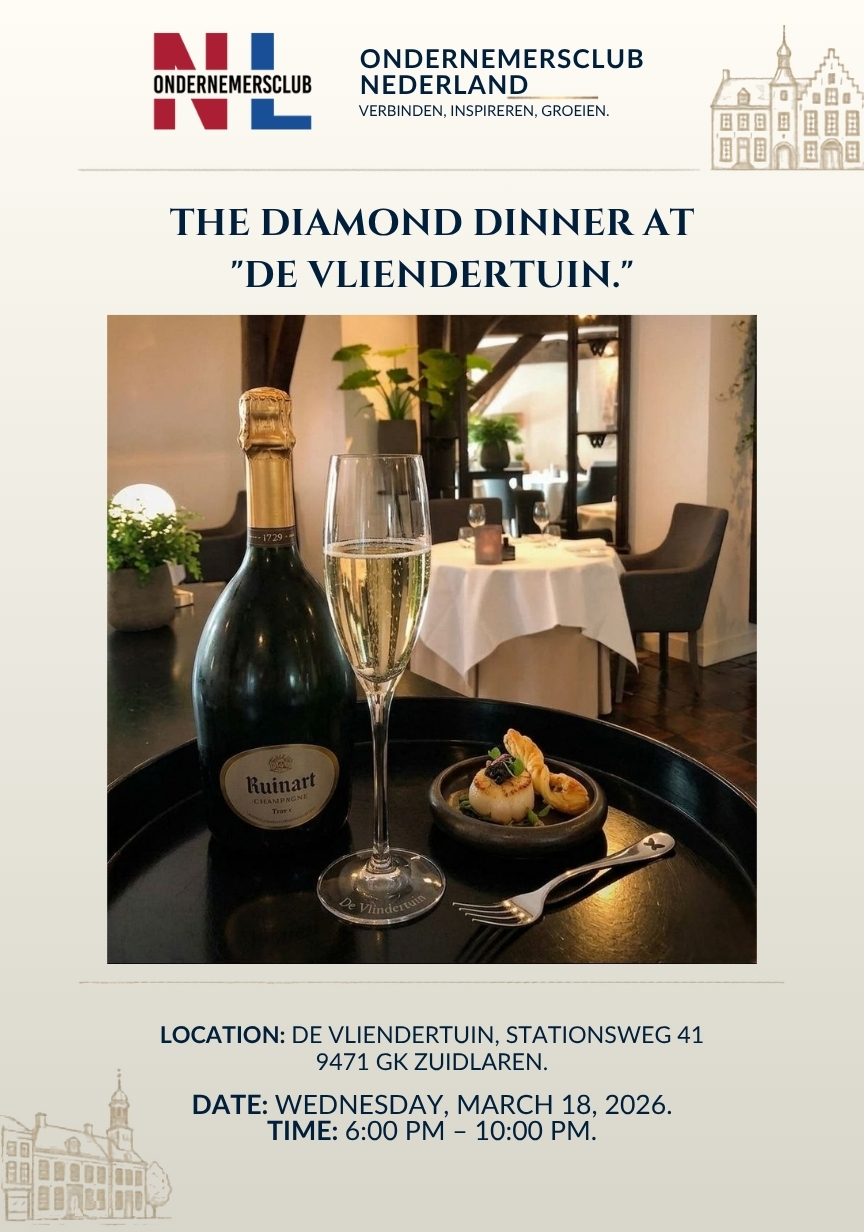 Op 18 maart verwelkomen wij onze Diamant-leden voor een exclusieve avond op het hoogste niveau binnen Ondernemersclub Nederland.